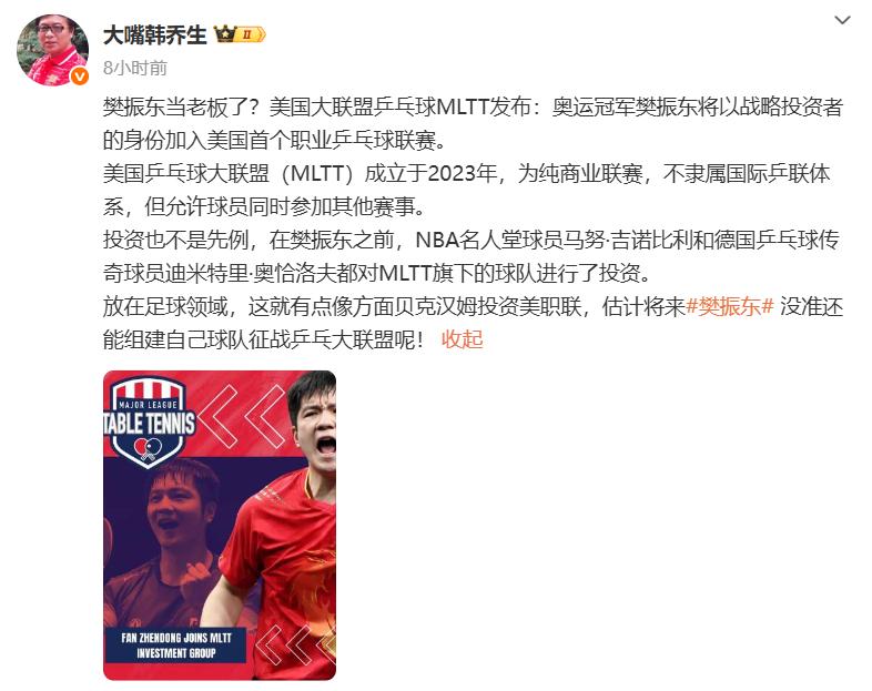 Vào ngày 6 tháng 8 năm 2025, tin tức lớn được phát hành bởi Hiệp hội bóng bàn chuyên nghiệp (MLTT) trên phương tiện truyền thông xã hội đã gây sốc cho thế giới thể thao toàn cầu: Người hâm mộ vô địch Olympic Zhendong chính thức gia nhập giải đấu mới nổi này với tư cách là một nhà đầu tư chiến lược! Sau khi thông báo được công bố, vào ngày 7 tháng 8, tài khoản chính thức của ITTF đã nhanh chóng thích nó, bày tỏ sự hỗ trợ của nó đối với hoạt động xuyên biên giới của "Hoàng tử Tablerobe" theo cách im lặng nhưng mạnh mẽ. Điều thú vị hơn là "Trong lĩnh vực bóng đá, nó giống như Beckham đầu tư vào Liên đoàn Mỹ." Nhà bình luận thể thao nổi tiếng Han Qiaosheng ngay lập tức bày tỏ ý kiến của mình trên phương tiện truyền thông xã hội, "Tôi đoán người hâm mộ Zhendong có thể thành lập đội của riêng mình để thi đấu trong giải đấu bóng bàn trong tương lai!" Phán quyết hướng tới tương lai này phác thảo các số liệu bóng bàn hàng đầu của Trung Quốc từ các vận động viên đến hỗ trợ của đội. BluePrint biến đổi của ai đó