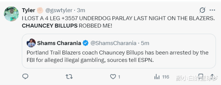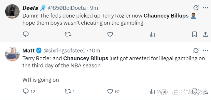 Theo báo cáo tiếp theo của Tome Winter, Billups đã bị bắt vì nghi ngờ cá cược bất hợp pháp. Hai quan chức thực thi pháp luật cấp cao nói rõ rằng việc bắt giữ Chauncey không phải vì tham gia một trò chơi mà anh ta huấn luyện. (Vụ việc này đã gây náo động khắp nước Mỹ vì cách đây vài phút, Shams đã báo cáo rằng Rozier đã bị FBI bắt vì cá cược bóng đá.)
