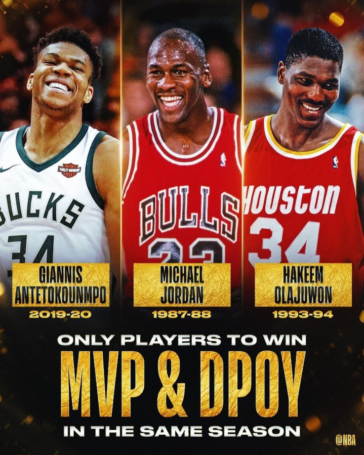Việc giành được cả MVP và DPOY trong một mùa giải khó đến mức nào? Chỉ có 3 cầu thủ trong lịch sử NBA làm được điều đó, đó là Michael Jordan mùa giải 1987-88, Olajuwon mùa giải 1993-94 và Antetokounmpo mùa giải 2019-20.