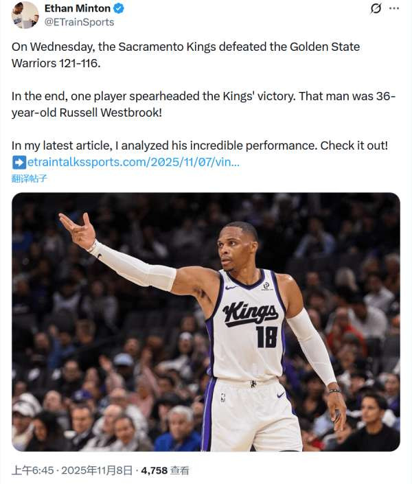 Vào ngày 9 tháng 11, mùa giải NBA mới tiếp tục diễn ra. Thời gian gần đây, ngôi sao Westbrook của Kings đã chơi rất tốt và nhận được rất nhiều lời khen ngợi. Đồng thời, Westbrook trở thành cầu thủ gác đền nhiều nhất NBA ghi được 20+5+5 trong 3 trận liên tiếp.